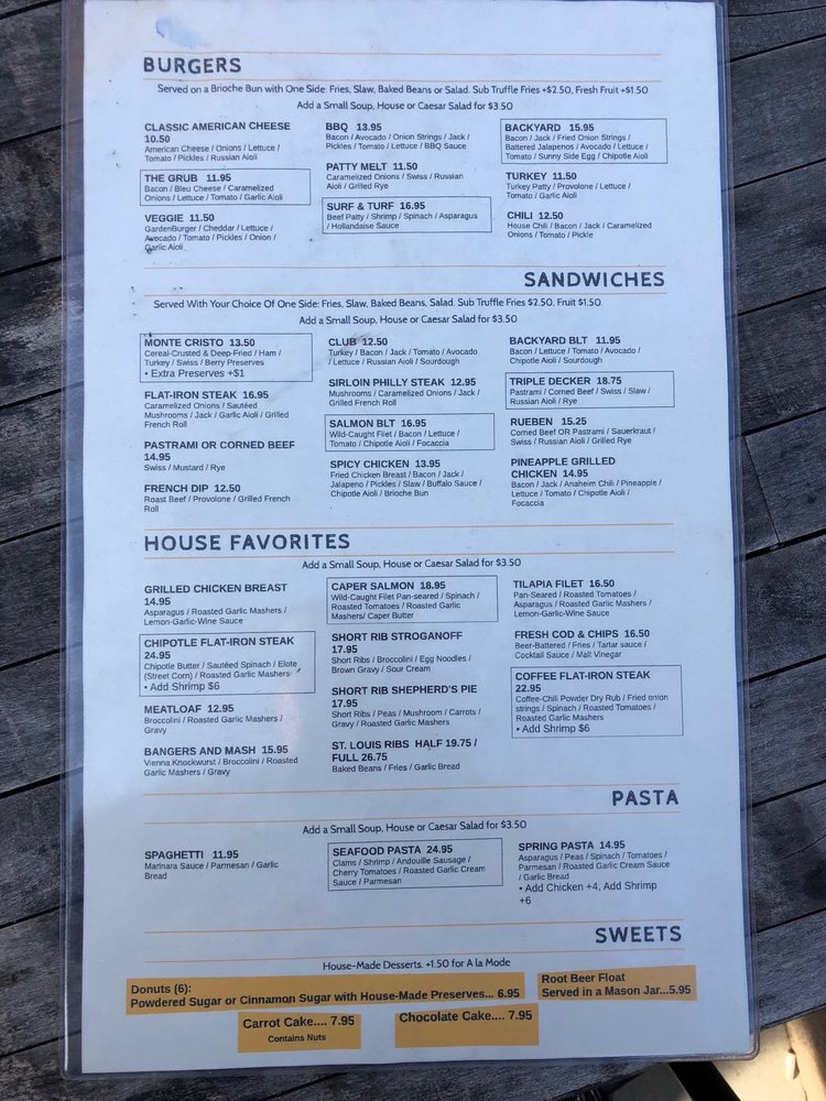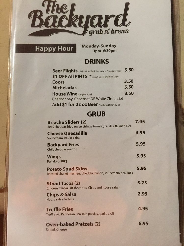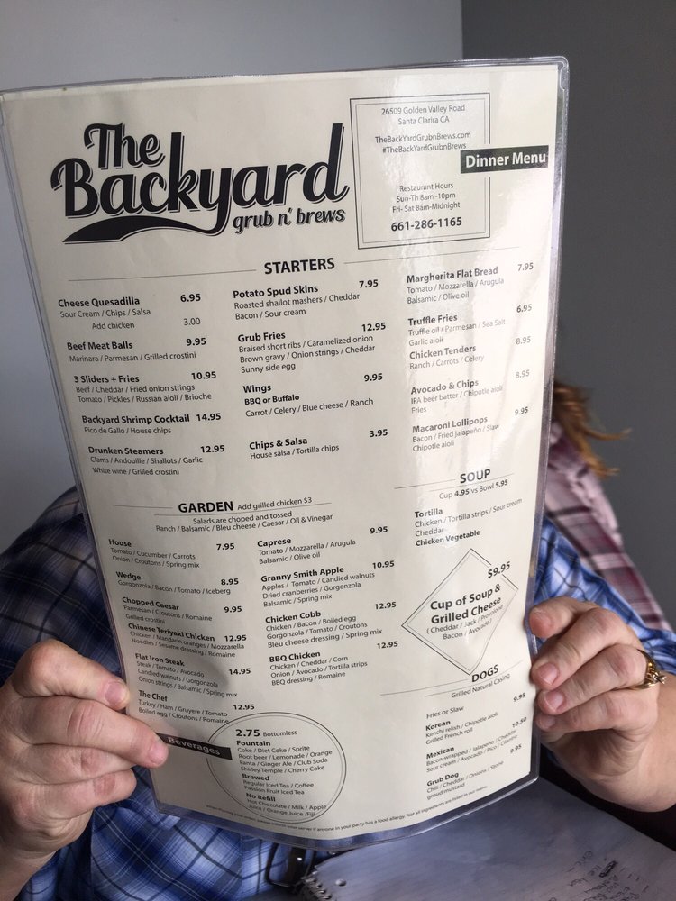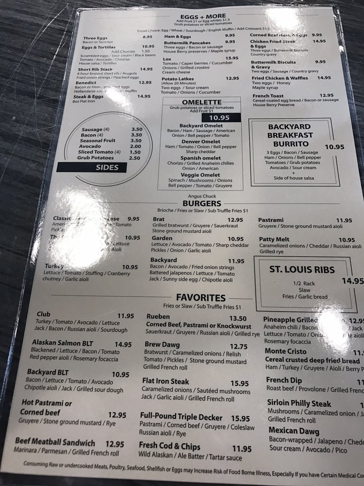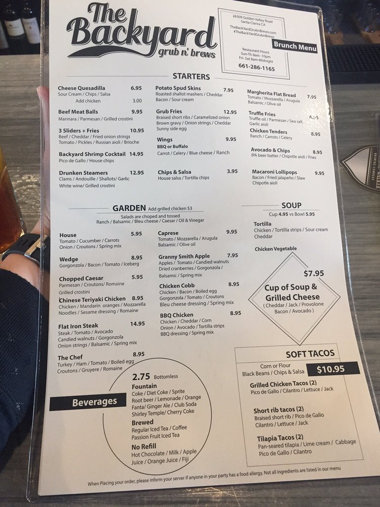 Welcome to The Backyard Grub n’ Brews, a gem nestled in Santa Clarita, where American breakfast and brunch shine. With a diverse menu featuring favorites like the tender flat iron steak salad and mouthwatering potato skins, diners can savor quality dishes made from top-notch ingredients. The menu's smart design allows for plenty of variety, whether you're in the mood for classic breakfast options or hearty lunch fare.